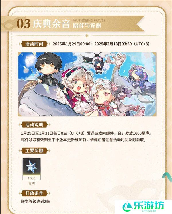 活动期间,每日0点(UTC+8)通过游戏内邮件发放奖励,总计可获得1600星声。邮件需在下次版本更新前领取,漂泊者请注意时间!