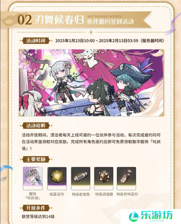 活动期间,漂泊者每天可以邀约一位伙伴参与活动,完成邀约即可领取奖励。完成所有角色邀约后,免费获得散华服饰「妖诰」!