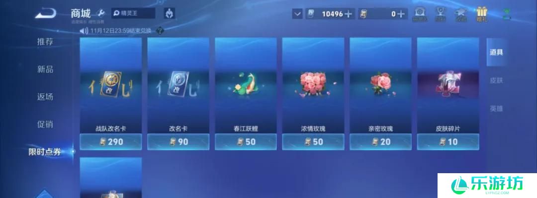 入口改成商城的最后一栏,大家现在就可以去看看还有没有剩余的限时点券,不管是选择兑换皮肤碎片还是亲密玫瑰,都最好是能清空。