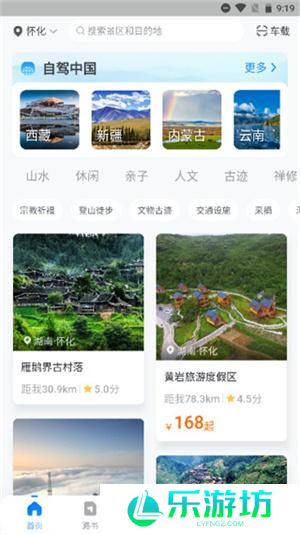 2、点击进入首页,你可以自行选择山水、人文、古村落、亲子游等,查看推荐去的地方;