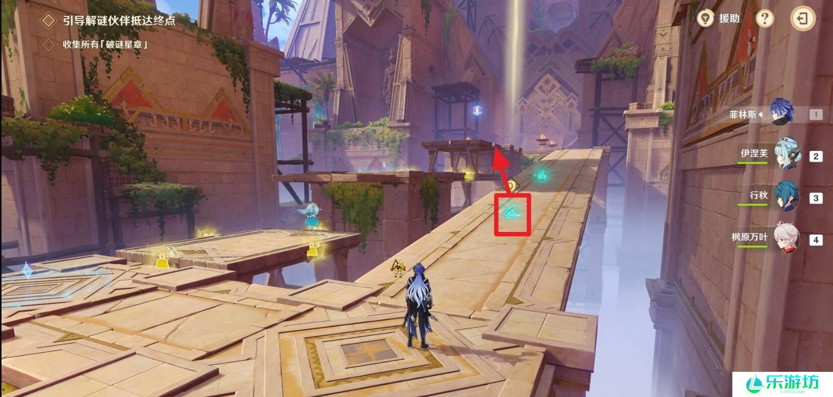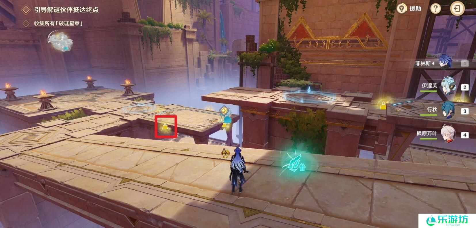 等待珐露珊解谜伙伴走上第二块石头平台时,用刚才拾取的蓝色增益替换掉第二块石头平台上的黄色增益。