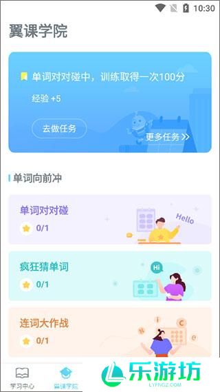 2、在“翼课学院”界面,您可以做任务,训练提高英语能力的呦,有单词对对碰、疯狂猜单词、连词大作战等等。