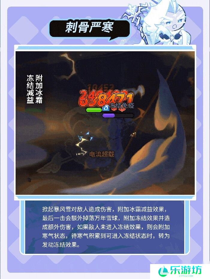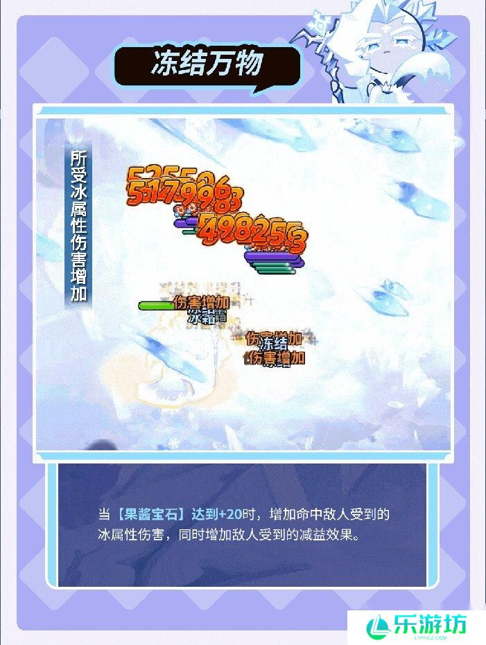 果酱宝石使冰霜的力量变得更强大,技能不会受到攻速增减效果影响。释放技能时掀起暴风雪攻击敌人,附加冰霜减益效果,最后一击会掉落万年雪雪球造成额外伤害,并附加冻结状态。如果敌人未进入冻结状态,则会附加寒气减益效果,降低防御力与移动速度,当寒气积累到可进入冻结状态时,寒气会转为发动冻结效果。与雪酪饼干一同出战时可触发额外效果,提升自身伤害减免与生命值。